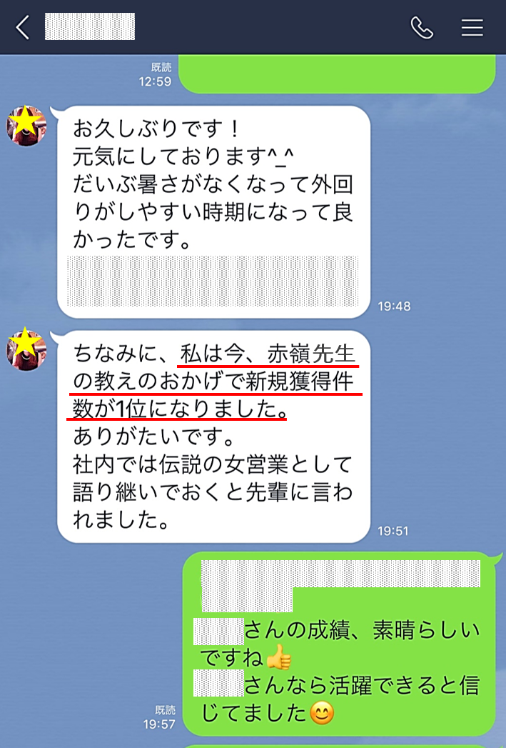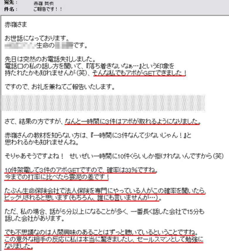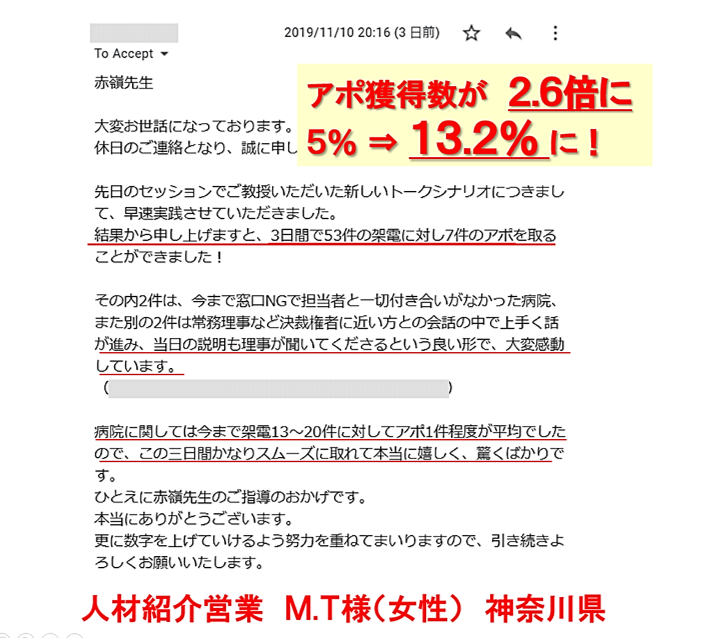 赤嶺先生には、相手に伝えたい情報の言い回しや話す順番を一字一句の単位で指導してもらいました。その結果、企業保険年払い170万円の高額契約ができました。最初のTELアポから一度の訪問とメールや電話のやりとりだけで、成約まで約1ヶ月の期間でした。これは本当にびっくりしました。その高額契約ができた要因は、まさに赤嶺先生のノウハウのおかげです。高額商品が短期間で契約できたのも相手に説得力のあるトークシナリオでしたので、短い時間で相手から信頼が得られたと思います。他社からの見積りも出ていましたが、比較説明に時間をかけませんでしたし保険料を安く抑える話にもなりませんでした。赤嶺先生には親身になってご指導下さっており本当に感謝しています。