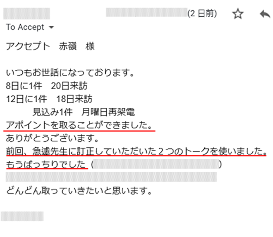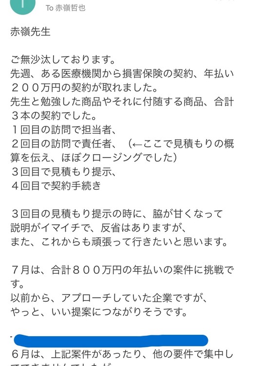ちなみに、こちらは、保険代理店を経営する募集人の方からいただいた営業実践報告です。